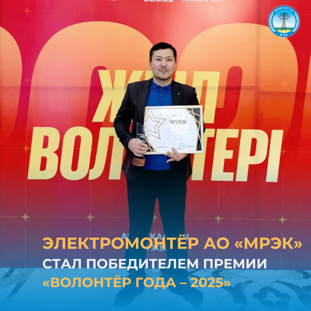 Халықаралық волонтерлар күнін тойлау аясында «МӨЭК» АҚ Бозащы ЭЖА(РЭС) қосалқы станциясына қызмет көрсету жөніндегі электромонтер Шапағат Ізбенов «Жыл волонтері – 2025» сыйлығының «Салауатты қоғам» номинациясы бойынша жеңіске жетті. Байқауды Маңғыстау облыстық жастар саясаты мәселелері жөніндегі басқармасы ұйымдастырып, өңірдегі ең белсенді және әлеуметтік маңызы бар еріктілерді жинады.